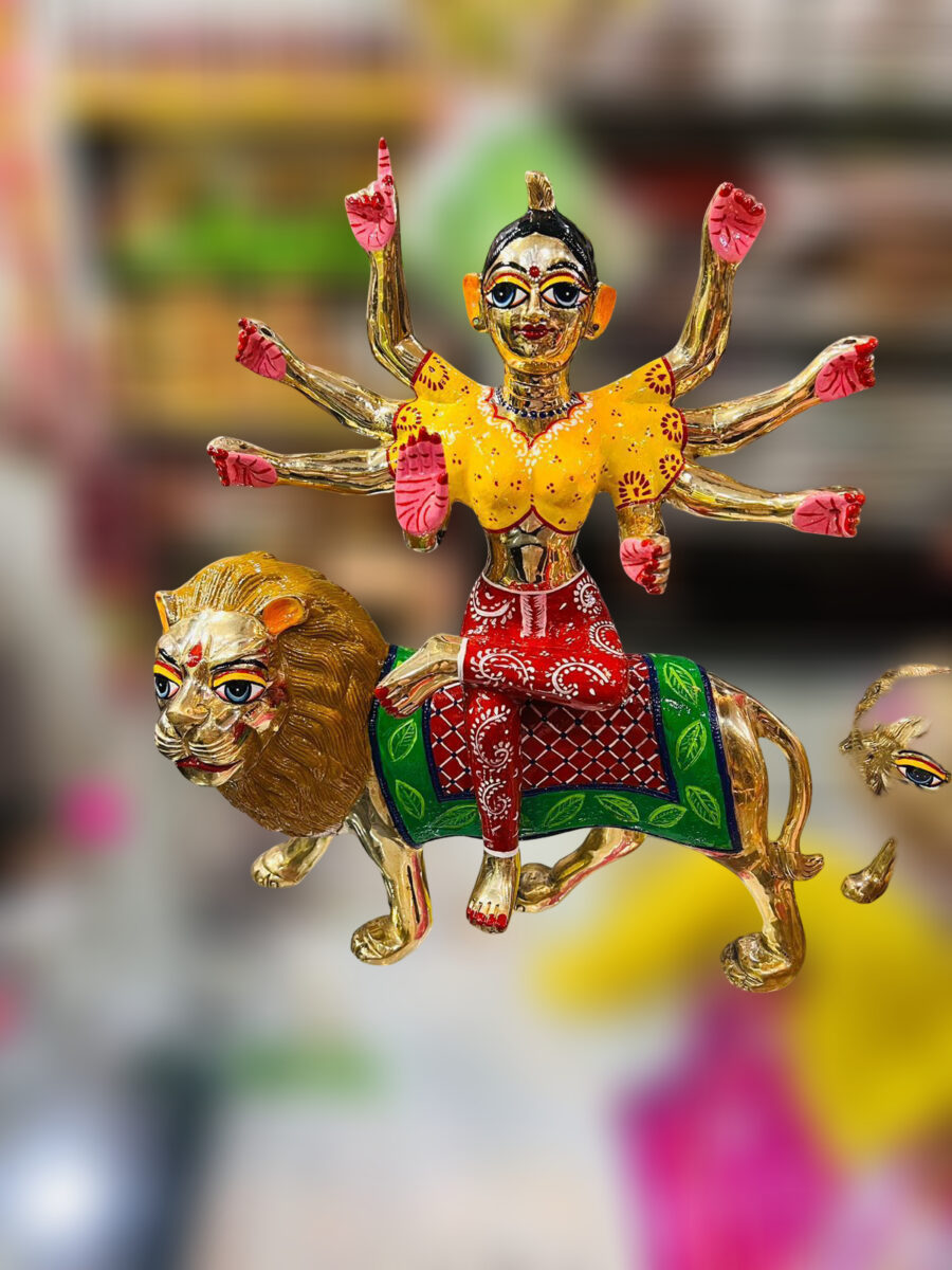 This 15-inch Mata Rani idol is a majestic piece crafted from pure Astdhatu (a sacred eight-metal alloy), symbolizing divine power and spiritual strength. Dressed in rich traditional attire, the idol features intricate detailing and a commanding presenceβ€”perfect for large home temples, Navratri setups, or religious events. Bring home the blessings and protection of Maa Durga in her most graceful form.