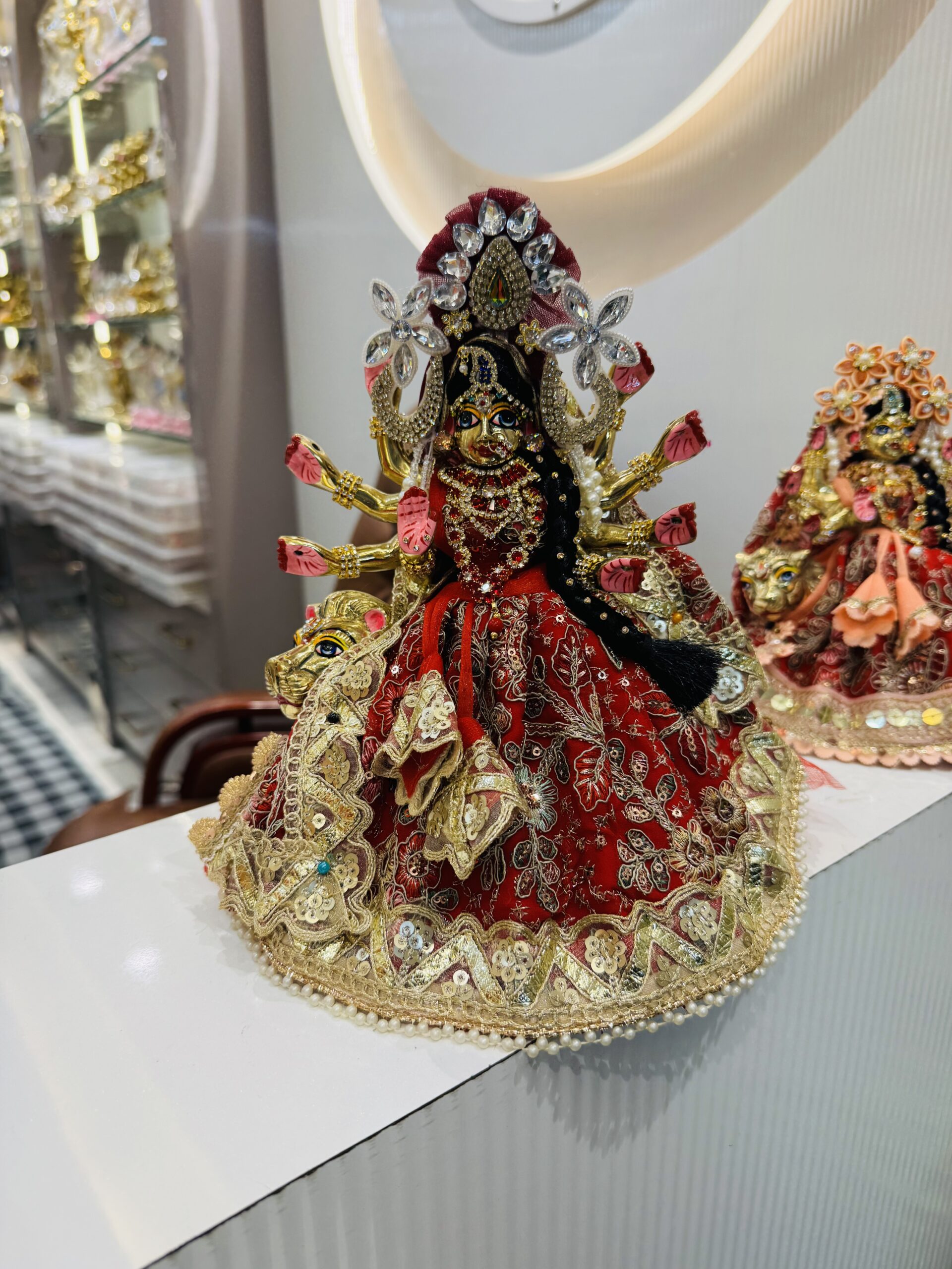 This 8-inch Mata Rani idol is beautifully crafted from sacred Astdhatu (eight-metal alloy) and comes ready with an elegant light green poshak. Perfectly dressed and detailed, it is ideal for home temples, Navratri celebrations, and daily worship. The vibrant light green attire symbolizes growth and harmony, bringing divine blessings and positivity to your sacred space.